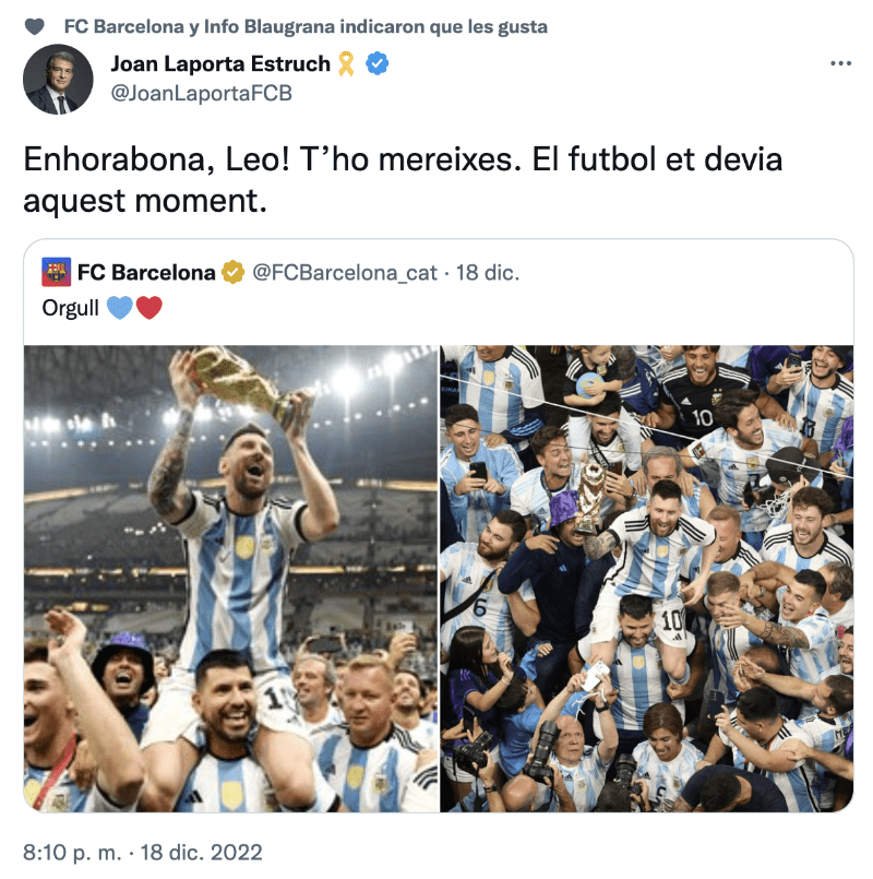 La selección argentina logró ganar la Copa del Mundo en Qatar y finalmente Lionel Messi levantó el ansiado trofeo ante la mirada atenta de millones de espectadores. Tras la obtención del título, Joan Laporta, presidente del FC Barcelona, quien traicionó a la ‘Pulga’ antes de marcharse al PSG, tuvo un gesto con el mejor jugador de la historia.