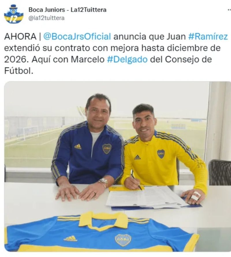 "Juan Ramírez firmó la mejora y extensión de su contrato hasta diciembre de 2026, junto a Marcelo Delgado del Consejo del Fútbol", expresó el club de La Ribera a través de sus redes sociales para dar a conocer la noticia a todos sus seguidores, quienes lejos de alegrarse inundaron el tuit con frases o palabras negativas.