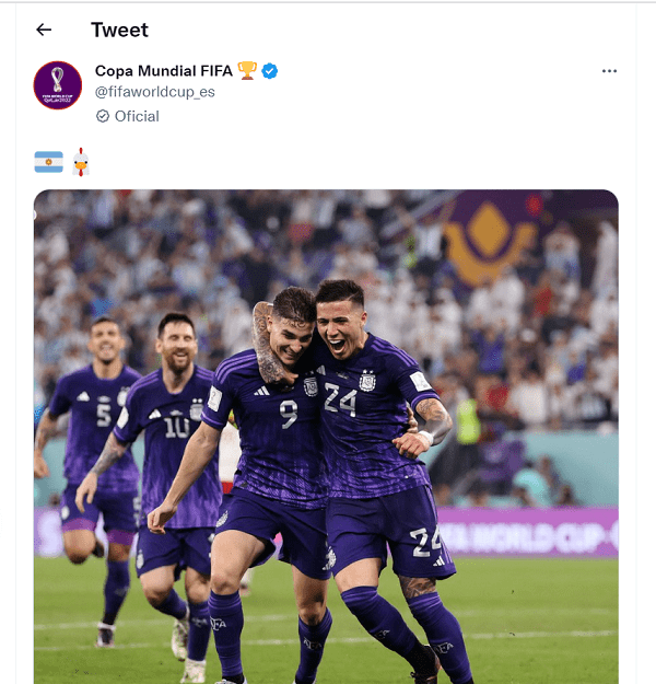 Luego, a los 22 minutos Enzo y Julián se encontraron como en su etapa riverplatense y fueron protagonistas del segundo gol. Fernández recibió y levantó la cabeza, dándole un pase con criterio para Álvarez, que no falló y estampó el 2-0 final. Desde la cuenta de Twitter del Mundial también lo hicieron. Una bandera de Argentina y el emoji de una gallina.