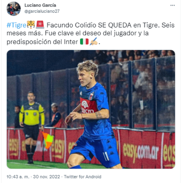 “Facundo Colidio se queda en Tigre. Seis meses más. Fue clave el deseo del jugador y la predisposición del Inter“. Esa es la información que entregó Luciano García en su cuenta personal de Twitter. Por lo tanto, River verá desde lejos a uno de los primeros futbolista pedidos por Demichelis. Sin dudas, una noticia que genera algo de sorpresa en el fútbol argentino, ya que a pesar de los ofrecimientos que recibió, el ex Xeneize priorizó su comodidad y seguirá en Victoria.