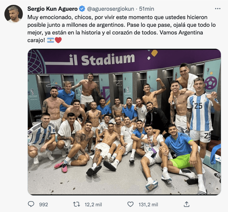 A poco del partido frente a los galos, Sergio Agüero, quien se retiró de la actividad profesional debido a una afección cardiaca, se pronunció a través de sus canales oficiales. El exjugador de Independiente de Avellaneda, Atlético de Madrid, Manchester City y FC Barcelona, se rindió a los pies de los 26 jugadores que dieron todo para meterse en una nueva final (la sexta en la historia).