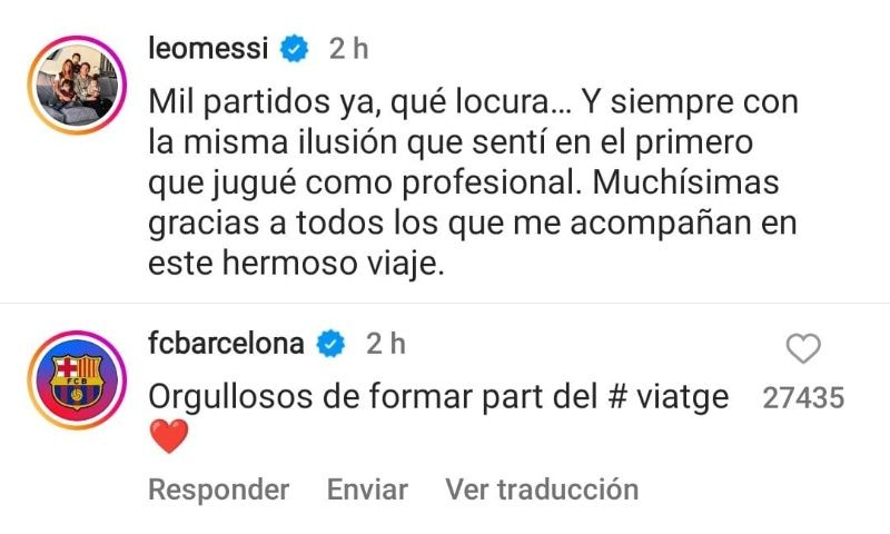 Para sorpresa de muchos, el FC Barcelona, equipo donde hizo la mayor parte de su carrera y consiguió 35 títulos, comentó el posteo (pese a que Leo no cerró de mejor manera su ciclo, todo por la traición de Joan Laporta). “Orgullosos de formar parte de este viaje”, puso la cuenta oficial blaugrana.