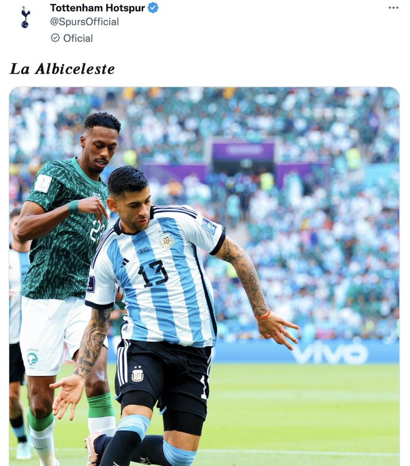 El cuadro de la Premier League está atento al desempeño de todos sus jugadores en el Mundial. Cuando la selección argentina debutó ante Arabia Saudita, el Tottenham también destacó al ‘Cuti’ Romero, quien no tuvo su mejor presentación. El defensor podría dejar su condición de titular ante México, luego del desempeño frente a los asiáticos.
