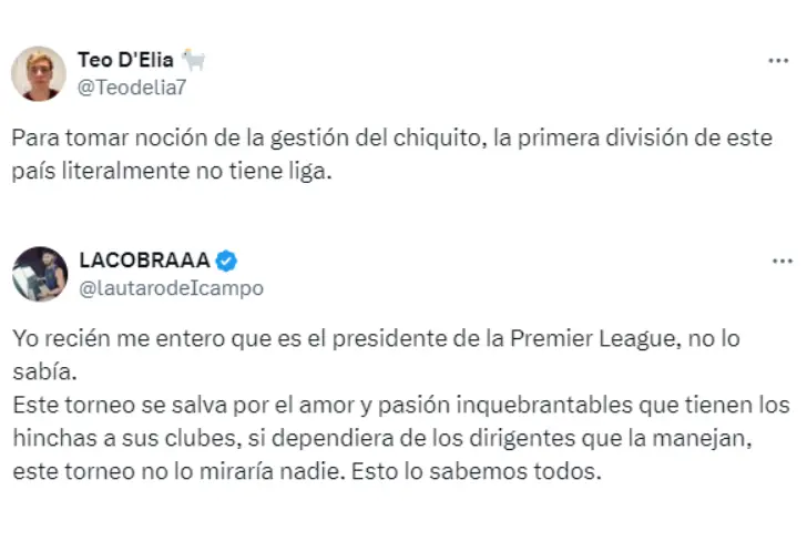 El streamer Lautaro del Campo, más conocido como La Cobra, no tuvo pelos en la lengua y dijo al respecto: "Yo recién me entero que es el presidente de la Premier League, no lo sabía. Este torneo se salva por el amor y pasión inquebrantables que tienen los hinchas a sus clubes, si dependiera de los dirigentes que la manejan, este torneo no lo miraría nadie. Esto lo sabemos todos". Mientras tanto, el actor Teo D'Elia, reconocido hincha de Estudiantes e hijo de Federico, sentenció: "Para tomar noción de la gestión del chiquito, la primera división de este país literalmente no tiene liga".